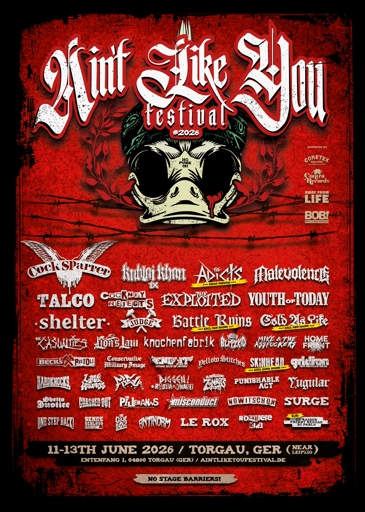 Unser Line Up für 2026 ist komplett! Das AIN’T LIKE YOU FESTIVAL 2026 wird fett! SEHR fett! Damit es das auch zukünftig bleiben kann, unterstützt uns gern, indem ihr unseren Flyer über all eure Kanäle teilt und uns damit in der Bewerbung supportet >> ihr findet ihn weiter unten auf dieser Seite.