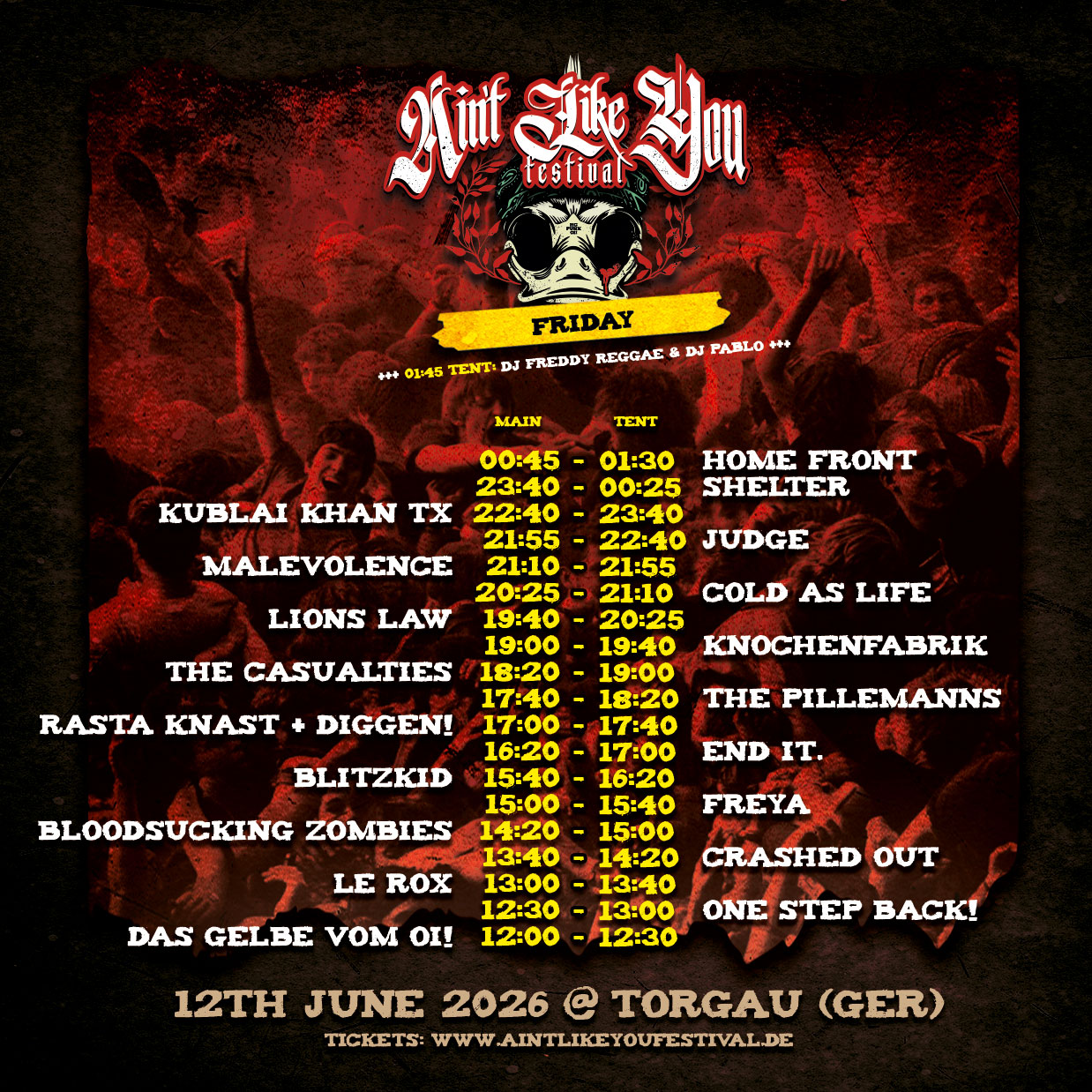 Hier findet ihr die Running Order für das AIN’T LIKE YOU FESTIVAL 2026. Eine downloadbare PDF im DIN A4-Format folgt kurz vor dem Start Festival. Für alles, die nur Einzeltage kommen möchten oder können, werden wir in Kürze auch den VVK von Tagestickets scharf schalten.